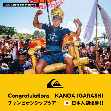 すでにみなさんご存じだと思いますが、先週土曜日にTOKYO2020サーフィン日本代表候補の五十嵐カノア(QUIKSILVER)がWSLチャンピオンシップツアー第3戦Bali大会にて日本人として(アジア人としても)初めて優勝しましたね~~!!